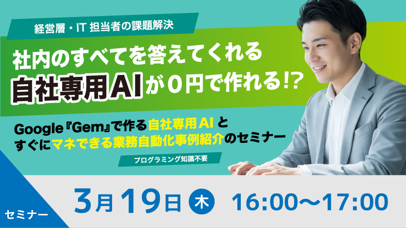 【無料オンラインセミナー】Google『Gem』で作る自社専用AIと、すぐにマネできる業務自動化事例紹介のセミナー